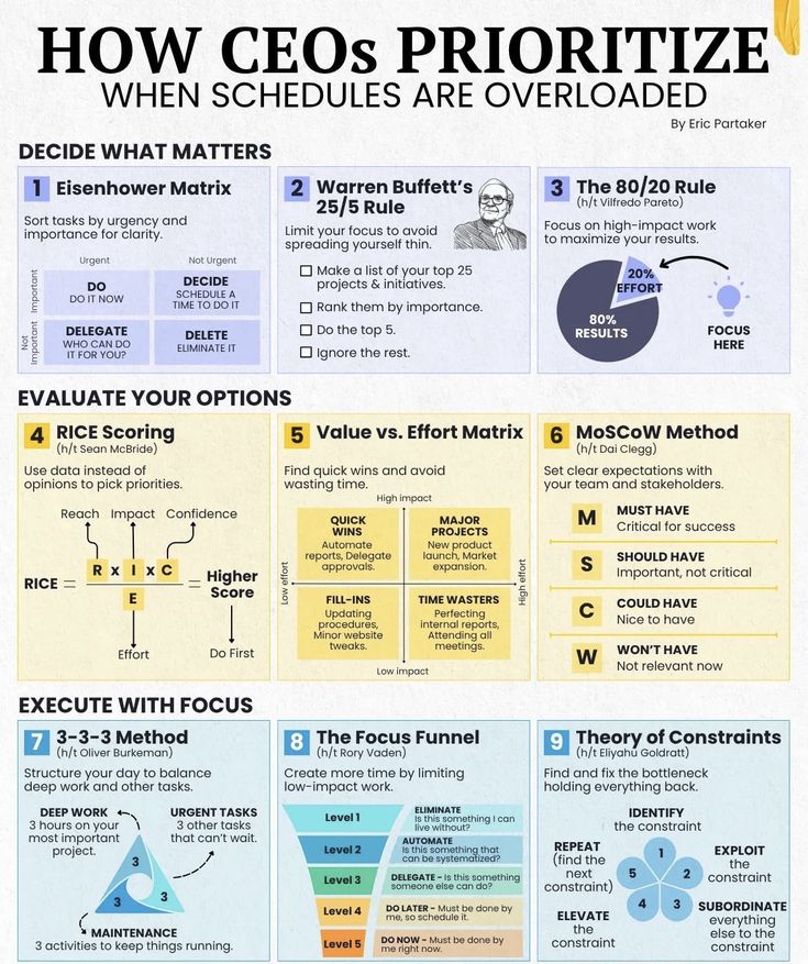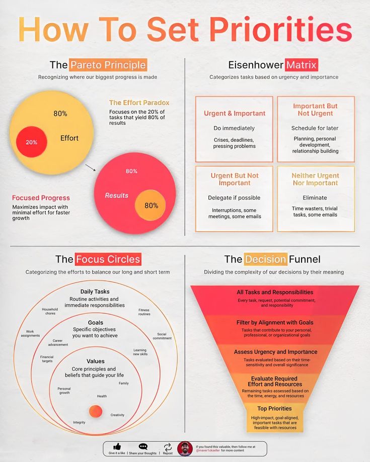 - Decision Funnel: inizia con “tutti i compiti/responsabilità”, filtra quelli allineati con gli obiettivi, valuta urgenza/importanza, valuta le risorse richieste, e infine definisci le priorità. È un modo per ridurre progressivamente il campo e focalizzarsi su ciò che ha senso.