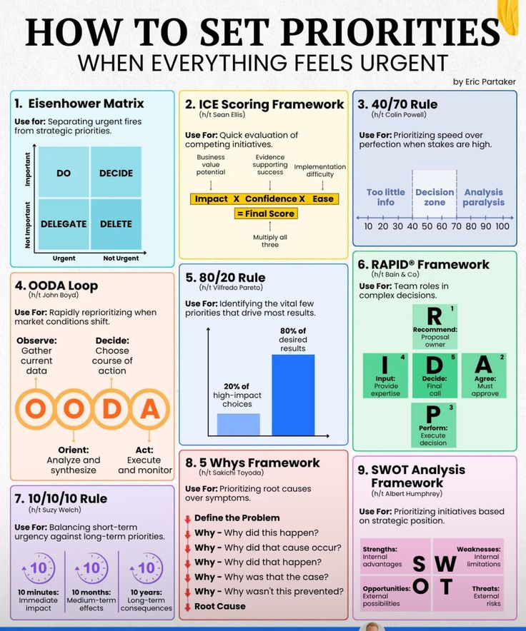 - Regole diverse come 40/70 (prendere decisioni con sufficiente informazione anziché aspettare la perfezione), 10/10/10 (valuta l’impatto decisionale su 10 minuti, 10 mesi, 10 anni), RAPID per il decision-making in team, OODA loop per ricalibrare in ambienti dinamici, ecc.