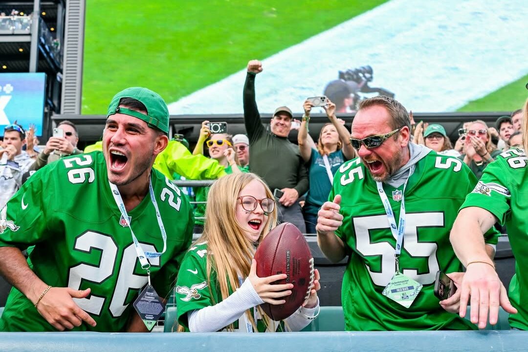 Una ragazza festeggia insieme alla sua famiglia dopo aver ricevuto il pallone del touchdown da Saquon Barkley. Tutti rigorosamente in Kelly Green. Foto presa dalla pagina Instagram ufficiale dei Philadelphia Eagles.