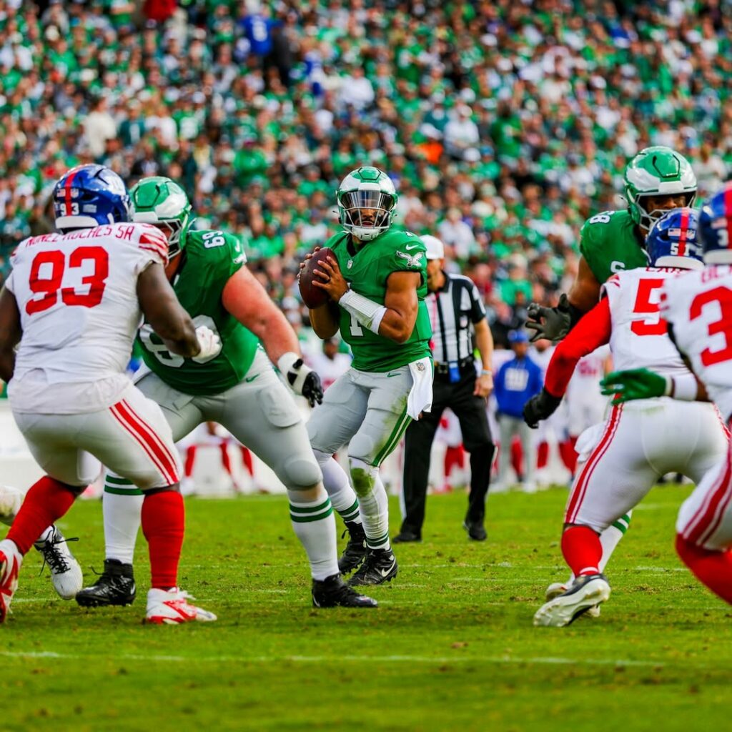 Il quarterback Jalen Hurts dei Philadelphia Eagles in Kelly Green, nella partita contro i New York Giants del 26 ottobre 2025, vinta da Philadelphia per 38 a 20, si appresta a lanciare. Foto presa dalla pagina Instagram ufficiale dei Philadelphia Eagles.